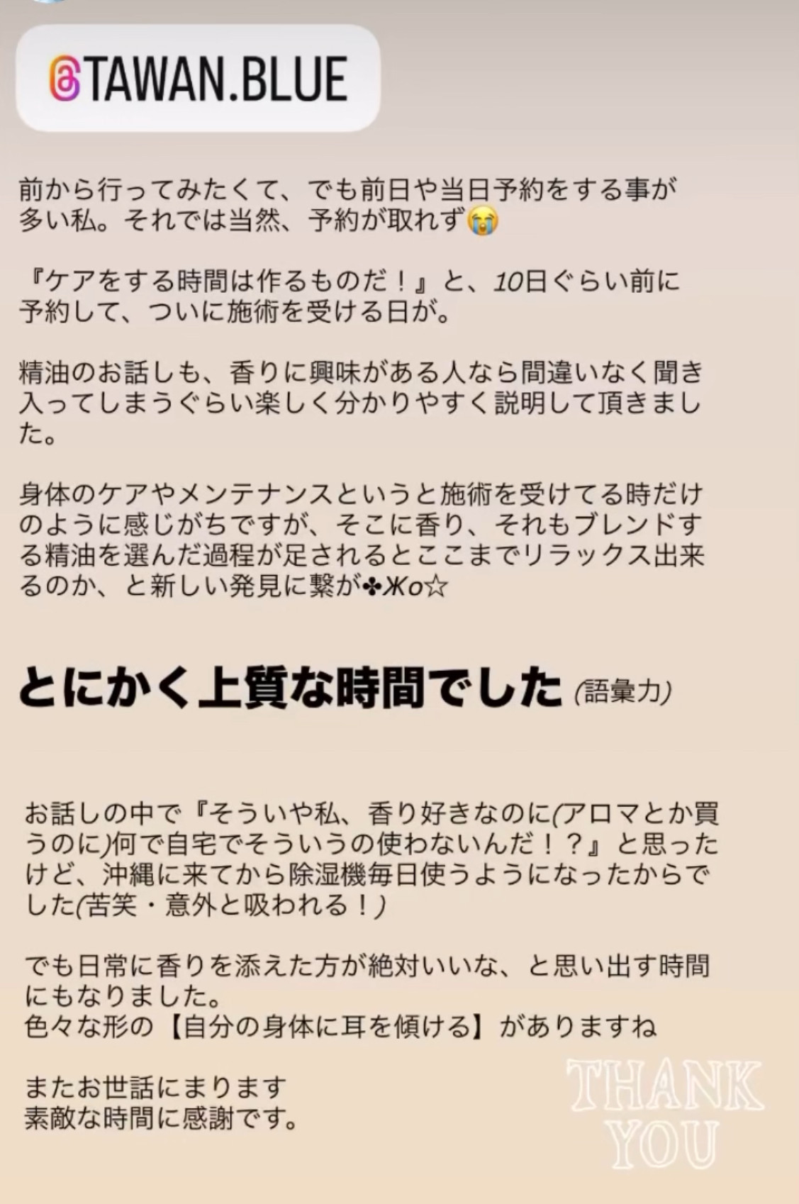 昨日は、ディープアロマオイル120分をご利用くださり誠にありがとうございました。
