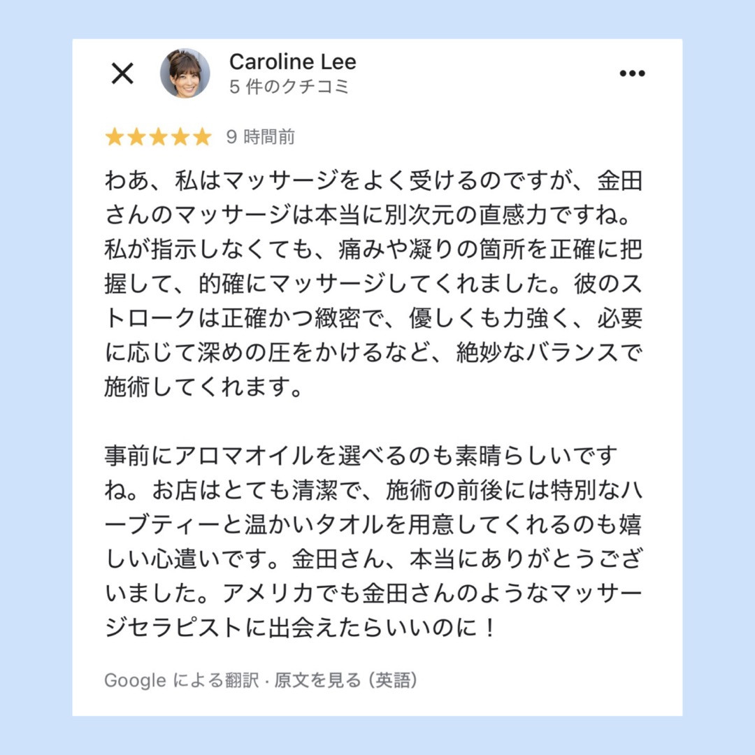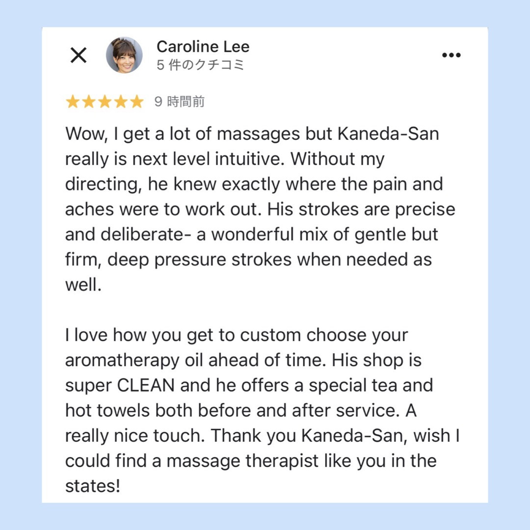 私は毎回、その方のお身体の状態に合わせて施術を組み立てることを大切にしているので、それを感じていただけたことが何より嬉しいです。